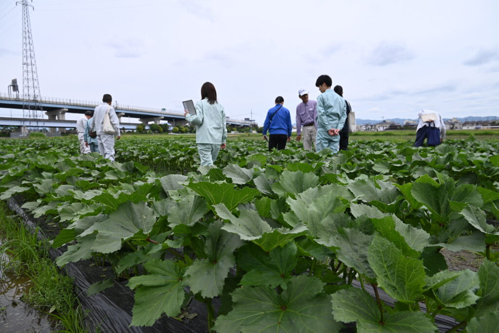 経済部営農販売課では、5月26日、今季の栽培が始まった「京おくら」の生育状況のほ場巡回調査を行いました。