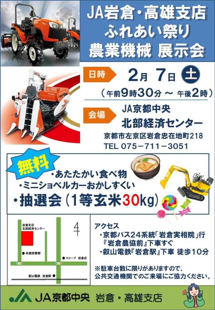 2月7日(土)は日頃の感謝を込めてJA京都中央岩倉支店・高雄支店合同でふれあい祭を開催します‼️